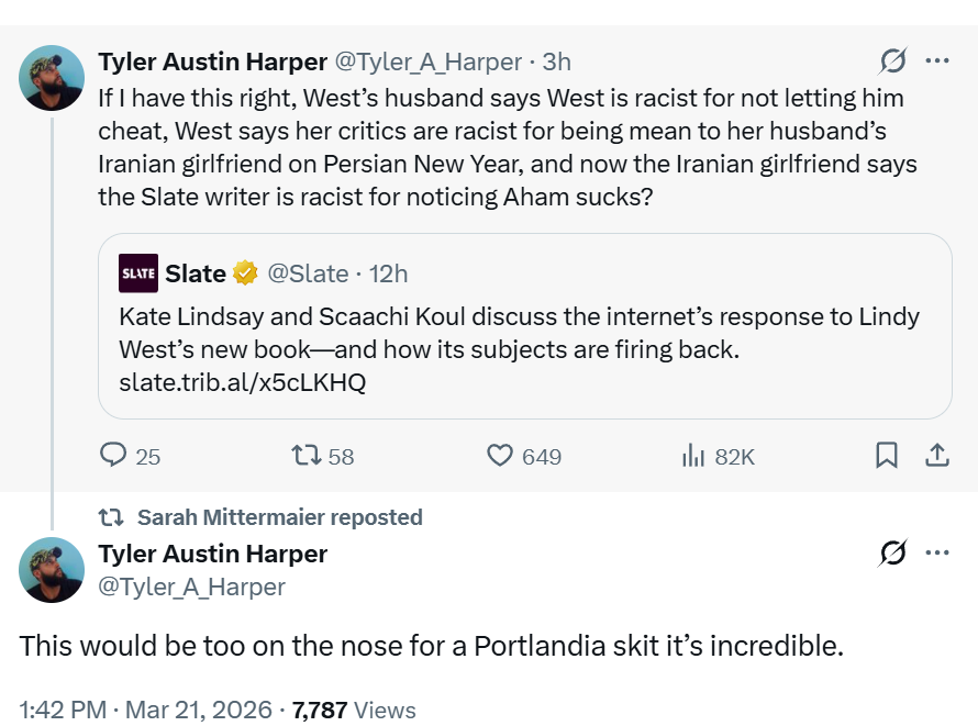 Given the blazing fire of media coverage that her memoir which sounds not at all fascinating has been getting, I am at this point near certain that Lindy West knows what she’s doing. Most of the coverage has been trying to educate LW about her naivete, explain the politics of her decisions to her, show her the comedy of her ways. At a rate of ten pieces or podcasts per day. We are so embarrassed for her. Ka-ching. Is she even aware that she has become a sister-wife of the kind only seen in certain religious minorities. Ka-ching. Lindy West: a trad wife for the progressives. Ka-ching. And her husband’s girlfriend is so thin, what does her fat activist self have to say about that. Ka-ching. Here’s a podcast episode on how LW and her hubster are now accusing everyone criticizing them of racism. Ka-ching. Her book is breaking through like few other non-fiction books this year.